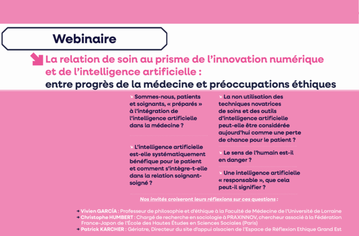 Le 28 octobre, de 17h30 à 19h, participez à notre webinaire « La relation de soin au prisme de l’innovation numérique : entre progrès de la médecine et préoccupations éthiques », organisé avec l’Espace de Réflexion Éthique Grand Est.